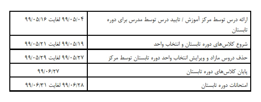 وی ادامه داد: با توجه به شرایط نسبتاً مناسب کنترل بیماری کرونا و برگزاری قابل قبول دروس در ترم جاری و به منظور مساعدت با درخواست مراکز آموزشی و رعایت وضعیت تحصیلی دانشجویان، درصورت امکان برگزاری دروس به صورت حضوری و تأیید امکان برگزاری دوره تابستان توسط روسای واحد استانی دانشگاه جامع علمی کاربردی و با هماهنگی ستاد استانی مقابله با بیماری کرونا، محدودیت ارائه واحد در دوره تابستان 99-98 لغو و دانشجویان متقاضی در هر استان میتوانند براساس قوانین و مقررات آموزشی و سرفصل دروس، نسبت به انتخاب واحد در دوره تابستان مذکور برابر مقررات جاری و تقویم آموزشی زیر اقدام کنند.