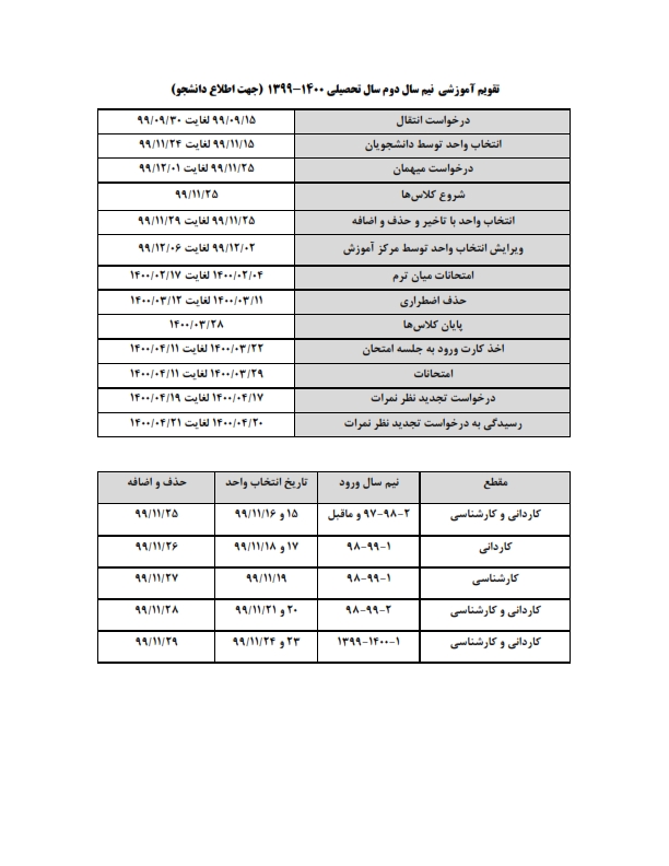 معاون آموزشی دانشگاه جامع علمی کاربردی گفت: انتخاب واحد دانشجویان این دانشگاه براساس تقویم آموزشی نیمسال دوم سال 1400-1399 از 15 بهمن ماه آغاز و تا 24 بهمن ماه سالجاری ادامه خواهد داشت و دانشجویان این دانشگاه می توانند دربازه زمانی اعلام شده برای انتخاب واحد خود اقدام کنند.